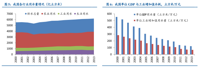 我国2013年供水总量为6183.4亿立方米,其中工业用水为1406亿立方米,占总供水量的23%。自2000年以来,我国单位GDP水资源消耗量从554下降到122立方米/万元(下降了78%),单位工业增加值水资源消耗量从285下降到68立方米/万元(下降了76%)。我们预计未来单位GDP与单位工业增加值水耗将进一步下降,但下降空间已不大,而工业用水量将保持1~2%的增速。