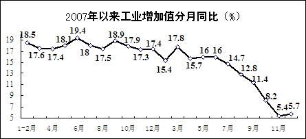 工业生产增速明显回落。2008年,规模以上工业增加值同比增长12.9%,增幅比上年回落5.6个百分点,比2003-2007年平均增速低4.1个百分点。