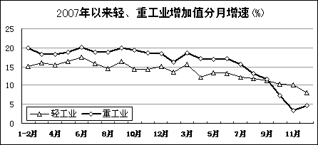 重工业生产增速明显下滑。2008年,轻、重工业增加值同比分别增长12.3%和13.2%,增幅比上年回落4和6.4个百分点。轻重工业增速差距由上年的3.3个百分点缩小到0.9个百分点。分月看,重工业增速自10月份开始低于轻工业增速,为1999年3月份以来首次出现。