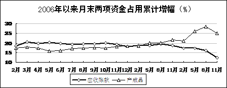 两项资金占用增幅回落。11月末,规模以上工业企业产成品库存资金占用23113亿元,同比上升25%,升幅比8月末回落3.5个百分点,同比提高3.2个百分点。应收账款净额45006亿元,上升12.3%,比8月末回落3.7个百分点,同比回落6.5个百分点。