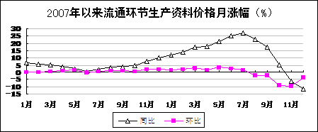 2008年,流通环节生产资料价格同比上涨13%,涨幅同比提高8.5个百分点。工业品出厂价格上涨6.9%,涨幅同比提高3.8个百分点;原材料、燃料、动力购进价格上涨10.5%,提高6.1个百分点。