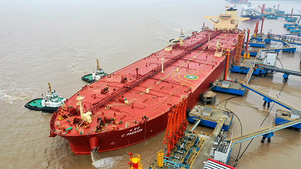 澎湃新闻从中国石化集团获悉,1月19日,宁波舟山港北仑港区算山码头,从沙特阿拉伯运载约26.2万吨原油的30万吨级“热情”号油轮缓缓靠泊并开始卸油,标志着算山码头累计吞吐量突破6亿吨大关,刷新国内企业自备海运码头累计吞吐量最高纪录。