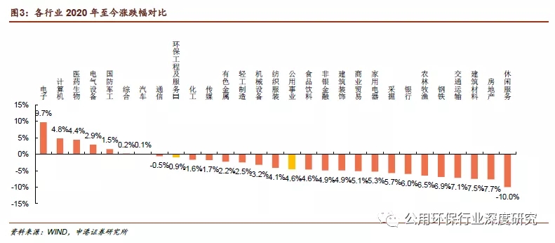 从配置时点角度,环保行业2018-2019年连续两年涨跌幅垫底,2020年初至今涨跌幅排名上升至前十,行业估值和市场关注度均有触底回升的表现。叠加此次新冠疫情对众多行业均有一定程度负面影响,而环保行业中市政运营类业务(垃圾发电、水务运营、环卫清运等)作为城市稳定运行的刚需,基本不受疫情影响,预计2020Q1业绩相对大部分行业表现更为稳健。