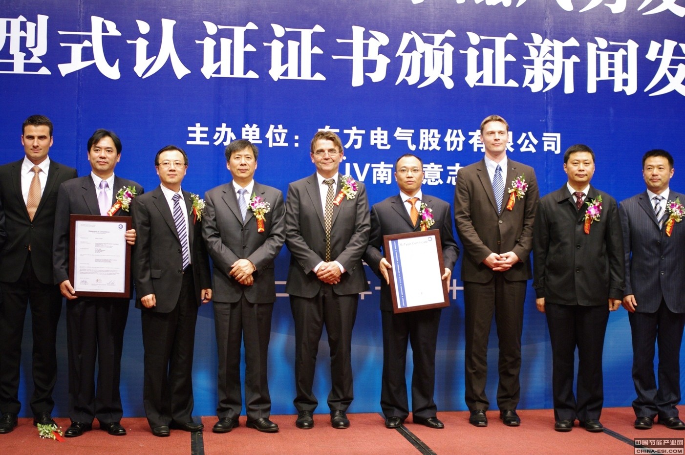 2011年10月20日,东方电气集团东方电机有限公司独资子公司东方电气新能源设备(杭州)有限公司公司(以下简称“新能源公司”)生产的DF82-1500直驱永磁风力发电机组通过TUV 南德意志集团(以下简称“TUV SUD”)按照 GL 导则进行的 A 级设计评估和型式认证,颁证仪式在北京国际风能大会暨展览会期间举行。TUV 南德意志集团风能部经理 Martin Webhofer博士和 TUV SUD大中华集团副总裁Wolfgang Hübl先生在仪式中分别向新能源公司技术开发部部长郑北超先生及新能源公司总经理詹明先生颁发了设计认证和型式认证证书。TUV SUD 大中华集团高级副总裁金灿先生、TUV SUD风能部总经理Ernst Donislreiter先生、东方电气集团党组成员、副总经理朱元巢先生、东方电气集团东方电机有限公司总经理贺建华先生、东方电机有限公司副总经理、新能源公司董事长兰向军先生等出席并且见证了本次仪式。
